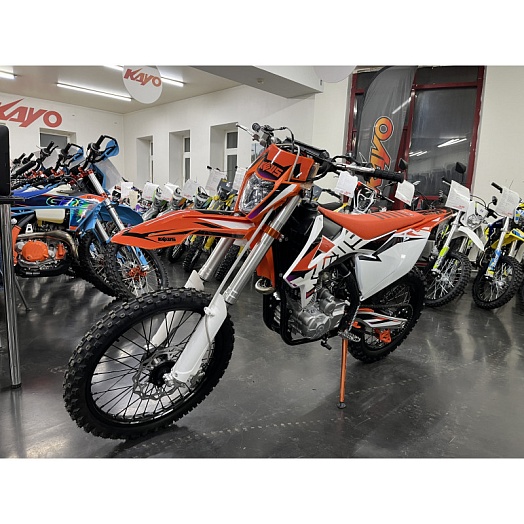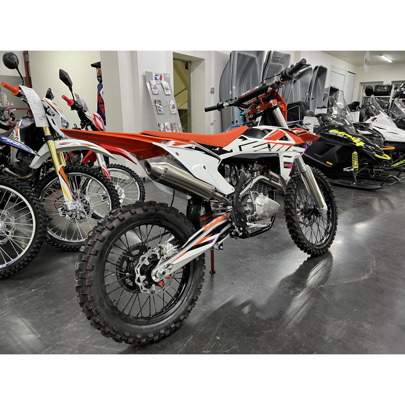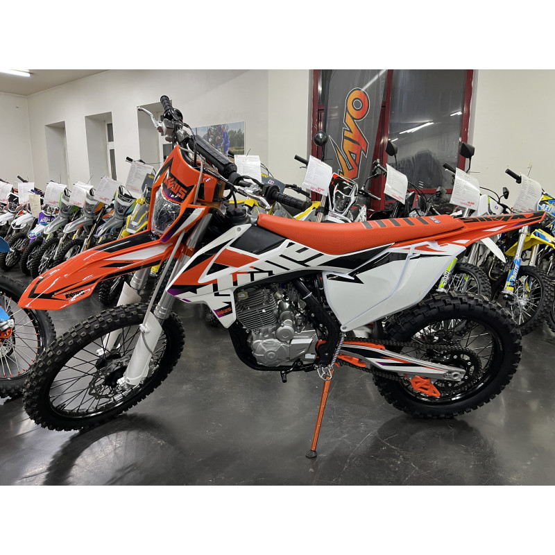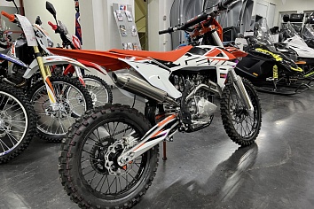 Рама правильной геометрии - копия KTM предыдущих лет. Популярный мотор ZS 175FMM в паре с карбюратором NIBBI PE30 выдают бодрые 25 л.с. Подвеска с регулировками, как спереди, так и сзади. Алюминиевый маятник. Алюминиевые диски. Прогрессия. Увеличенный топливный бак. Усиленный руль IGP 28 twinwall. Светодиодная фара. Счетчик моточасов.